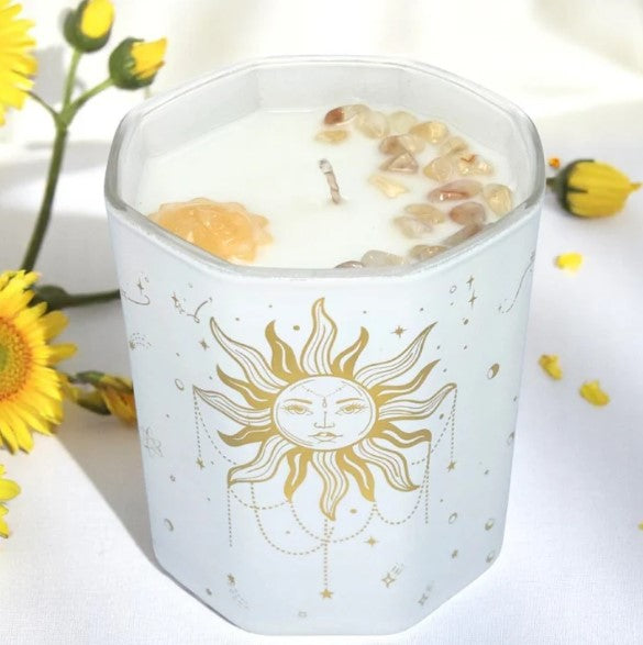 At the heart of the candle lies a Yellow Jade Sun pendant, a symbol of radiant energy, joy, and emotional harmony. Yellow Jade channels the warmth of the sun, encouraging optimism, confidence, and good fortune. As the candle burns, it reveals Citrine stone chips, often called the "Light Maker" stone, known for amplifying creativity, abundance, and positivity. Citrine resonates with the sun's natural vibration, helping to clear negativity and inspire new beginnings.