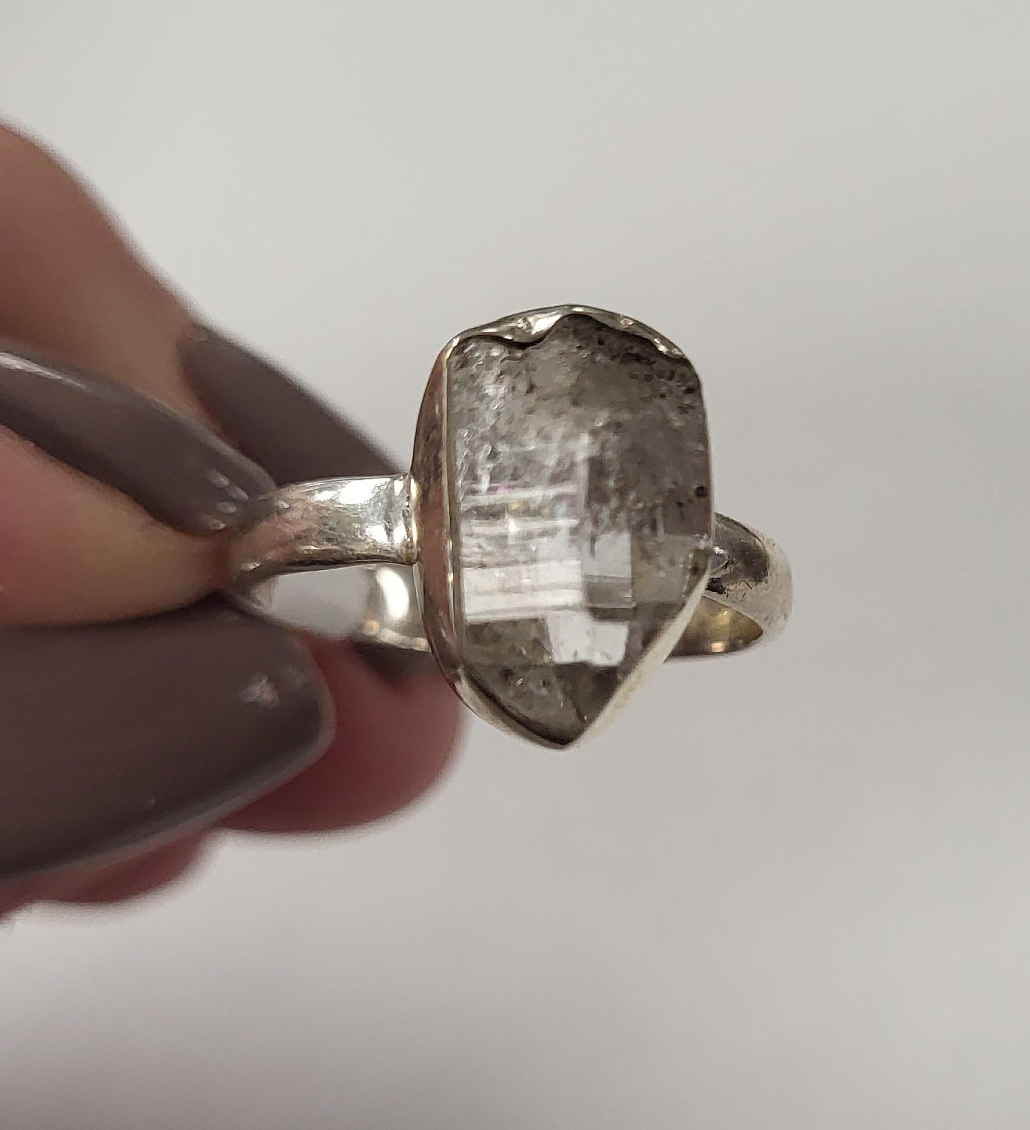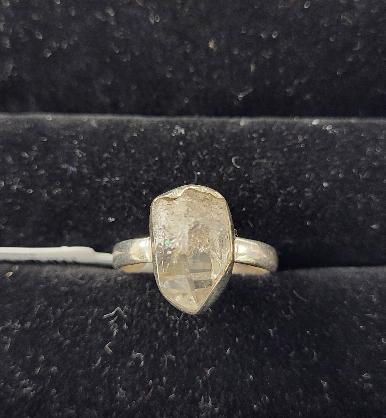Sparkle with intention in this raw Herkimer Diamond Sterling Silver Ring, where geology meets magic. Herkimer Diamonds are believed to amplify energy and clarity, making them the ultimate sidekick for anyone seeking mental sharpness and spiritual awakening. Set in genuine sterling silver and sized at 8.5, this beauty combines natural quartz brilliance with timeless elegance. Whether you're a crystal enthusiast or just love the idea of wearing a little piece of earth's sparkle, this ring brings both style and metaphysical vibes to your everyday adventures.
